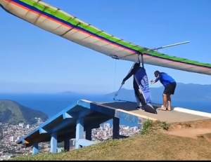 As cenas mostram o momento em que a asa-delta se desestabiliza, ainda em pleno ar, e o piloto despenca em direção a uma área de mata fechada, a aproximadamente 250 metros abaixo da rampa de salto.