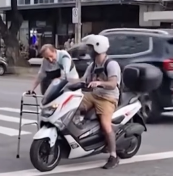 O vídeo mostra o professor de jiu-jítsu Vinicius Kioto usando a própria moto como uma espécie de escudo para proteger um idoso que atravessava a rua com a ajuda de um andador. Ele posicionou o veículo na pista, criando uma barreira para garantir que a travessia fosse feita com mais segurança.